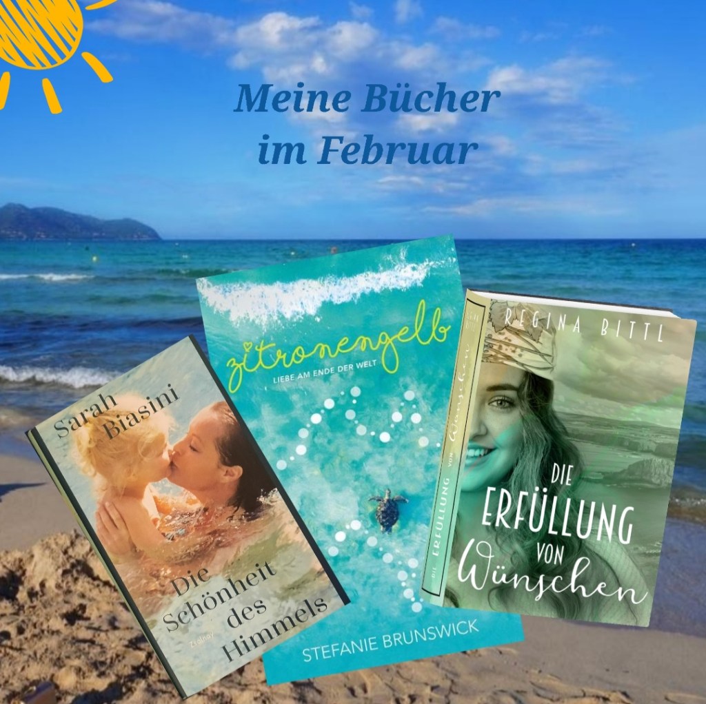 Trotzdem habe ich im Februar einiges gelesen und interessanterweise hatten all meine Bücher im Februar irgendwie mit dem Meer zu tun: Die Schönheit des Himmels von Sarah Biasini, der Tochter der unvergessenen Schauspielerin Romy Schneider, ziert ein Bild von Mutter und Tochter im Wasser, Die Erfüllung von Wünschen spielt am irischen Meer, Zitronengelb spielt an der australischen Küste. Ich bedanke mich herzlich bei Regina Bittl für das zur Verfügung gestellte Rezensionsexemplar Die Erfüllung von Wünschen, der Auftakt ihrer Austernfarm-Reihe. Ich war von dem ersten Band der Austernfarm-Reihe so begeistert und will sobald es möglich ist, den nächsten Teil der Reihe lesen. Mein drittes Buch war Steffi Brunswicks Erstlingswerk Zitronengelb – Liebe am Ende der Welt, von der ich schon das Buch Flockenkuss gelesen habe. Mit meinen Büchern hatte ich pures Summerfeeling mitten im Februar und mehrere Ausflüge ans Meer 😉