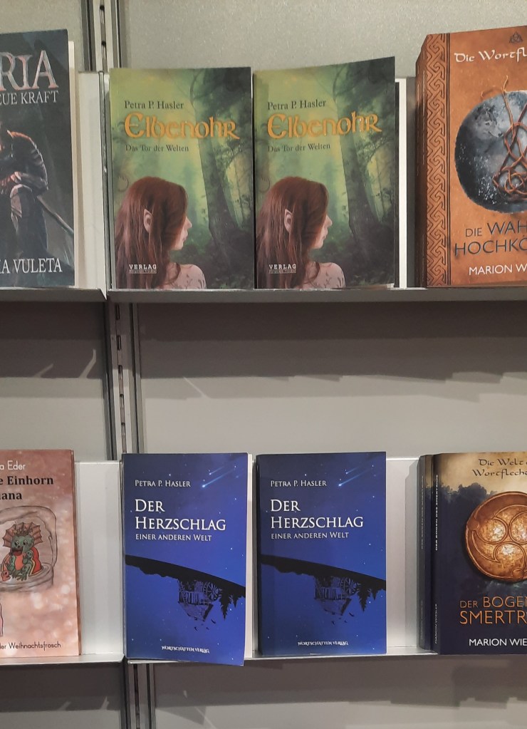 Beim Schlendern durch die Ausstellung hab ich außerdem ein paar altbekannte Cover entdeckt: Der Herzschlag einer anderen Welt von Petra P. Hasler und auch FOG von Cornelia Eder!