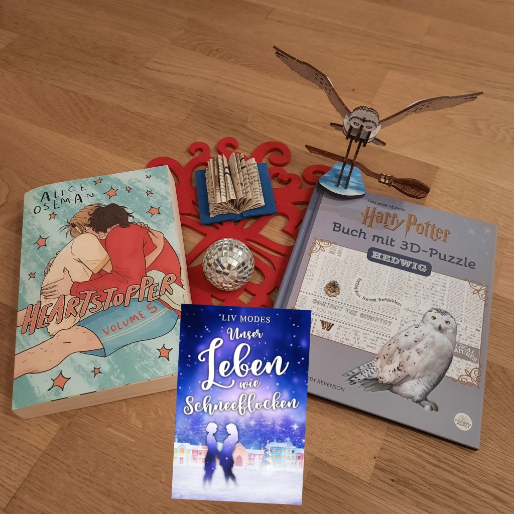 Meine Dezember-Bücher waren ein Harry Potter Buch mit 3D-Puzzle Hedwig, Liv Modes Unser Leben wie Schneeflocken und der fünfte Heartstopper Band von Alice Oseman.