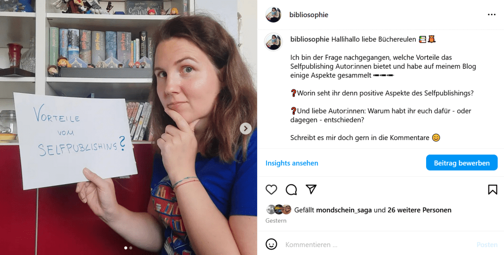 Mein letzter Selfpublishing-Beitrag drehte sich um das Thema, welche Vorteile Selfpublishing für Autor:innen bietet. Auf Instagram – und auch hier am Blog – habe ich viele Rückmeldungen von Autor:innen und Blogger:innen bekommen, und da dachte ich, ich trage mal die verschiedenen Eindrücke zusammen. Viel Spaß beim Lesen 🙂 (Zu meinem Instagram-Post geht es hier.)