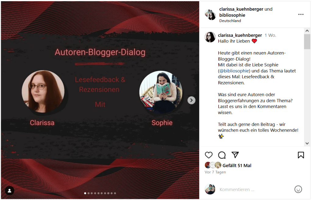 Ich finde eine gute Zusammenarbeit zwischen Autor:innen und Blogger:innen sehr wichtig und mag diese Kooperationen immer sehr gerne. Es ist toll, Autor:innen und ihre Bücher auf meinen Profilen vorstellen zu können und ich hatte besonders viel Spaß daran, diesmal auch einen Blick hinter die Kulissen des Bloggens zu bieten 🙂