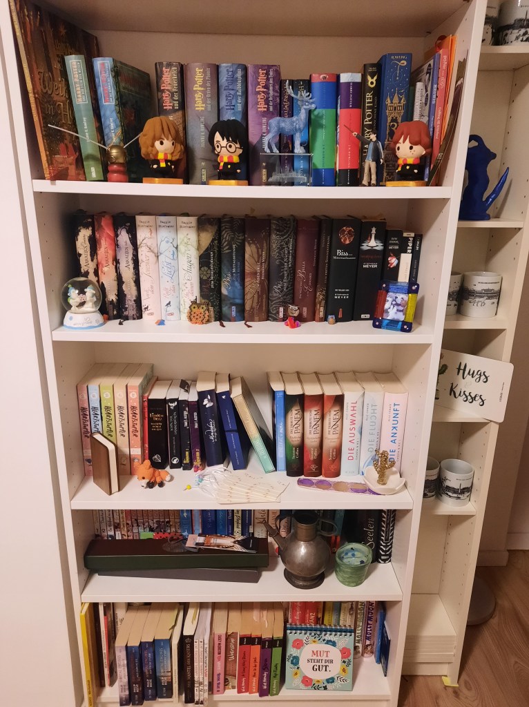 Außerdem habe ich meinen Selfpublisher-Büchern sowie Rezi-Exemplaren ein gemeinsames Plätzchen im Regal gegeben, um sie miteinander strahlen zu lassen.