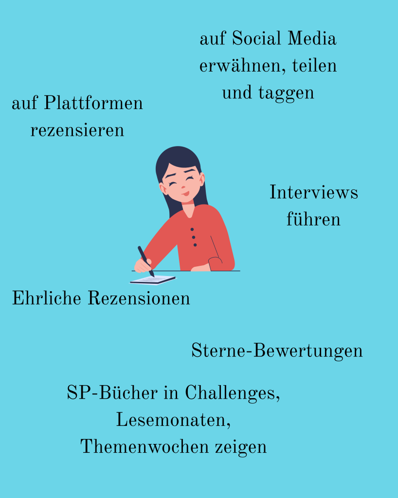 - Ehrliche Rezensionen auf den Plattformen veröffentlichen, denn so finden Bücher die passenden Leser:innen (und man hilft dem Algorithmus)
